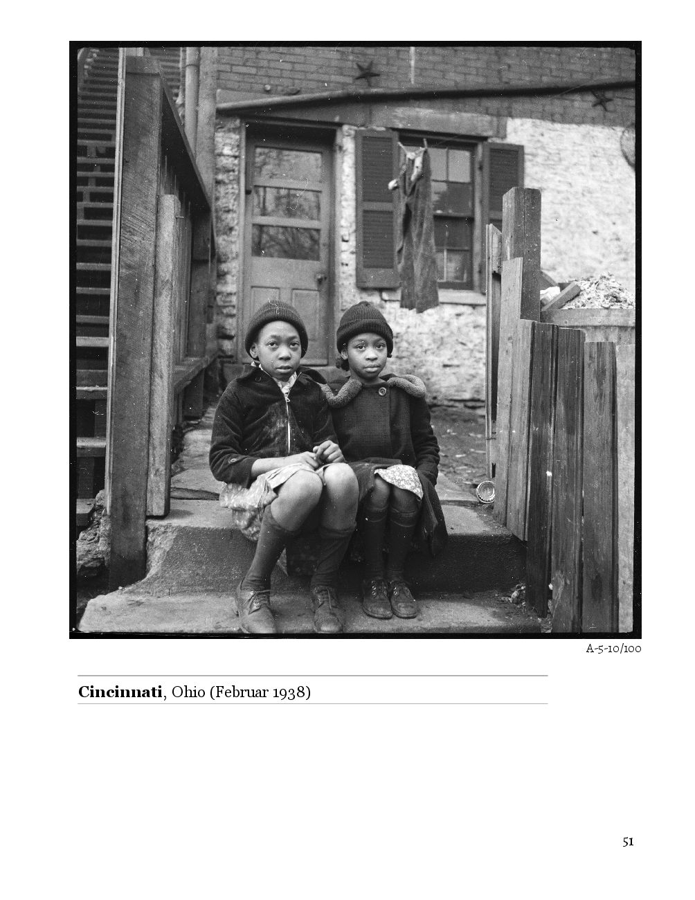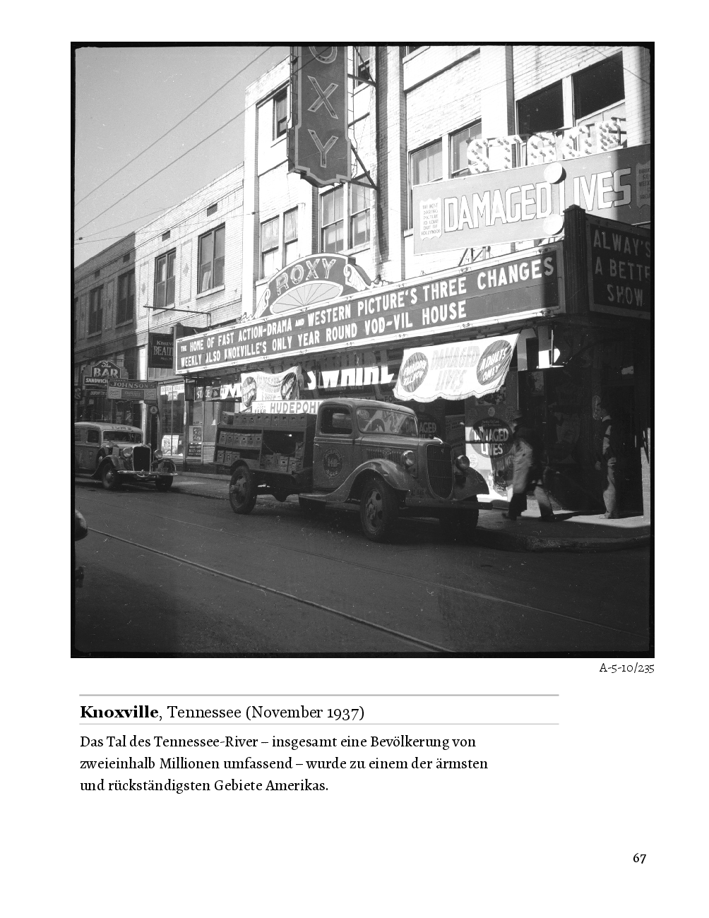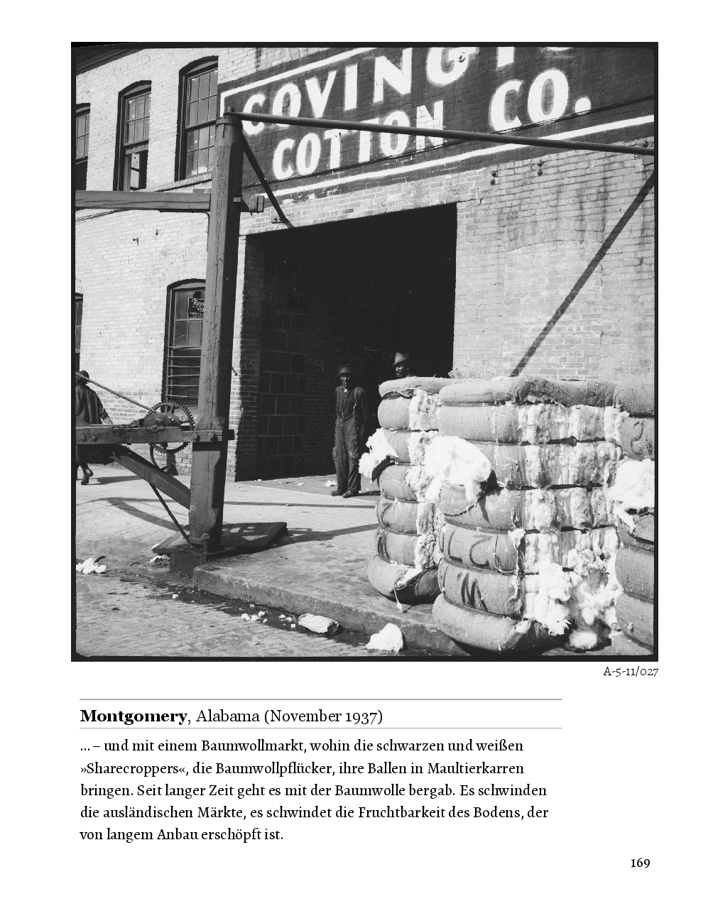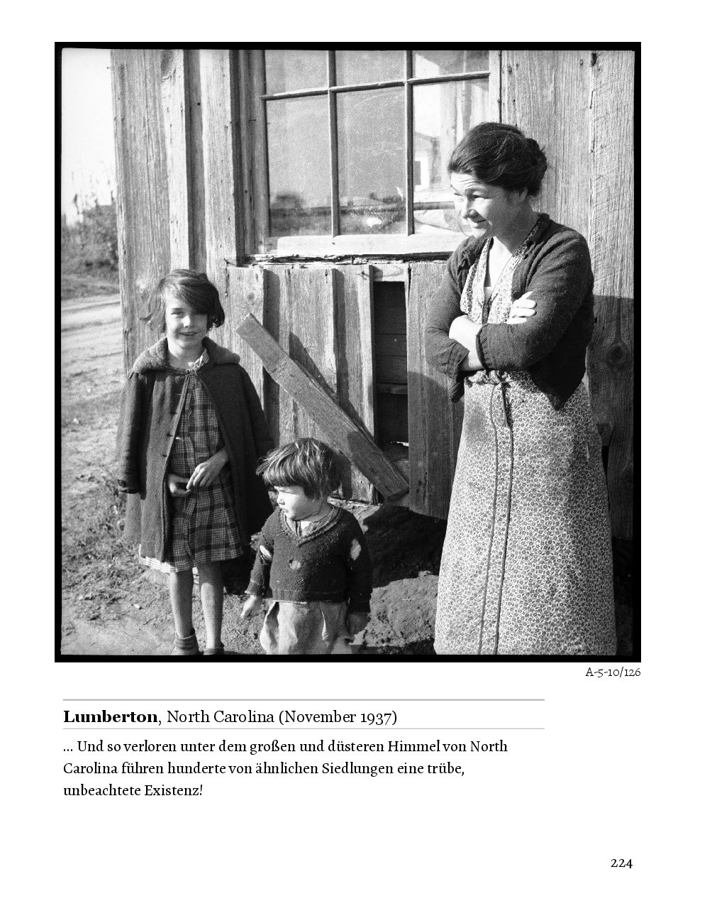 1929 hatte der Börsencrash in New York eine Wirtschaftskrise unvorstellbaren Ausmaßes ausgelöst, die schnell über die amerikanischen Grenzen in die Welt schwappte. Der wirtschaftliche Niedergang in den USA wurde verstärkt durch Naturkatastrophen - Überschwemmungen und Verödung einst fruchtbarer Gebiete als Folge exzessiven Raubbaus. Ab Januar 1937 bereiste Annemarie Schwarzenbach Pennsylvania, Ohio, West Virginia und New York. In Pennsylvania besucht sie unter anderem die Bergbauregion Mount Pleasant, in Ohio fährt sie in die Hafenstadt Cincinnati und besucht das Umsiedlungsprojekt in Greenhills. Außerdem fotografiert sie im Kohlerevier Scotts Run, West Virginia. Im Februar 1937 kehrte sie in die Schweiz zurück, ist Anfang Oktober aber schon wieder in den USA und bricht Ende des Monats zu einer Reportagereise in die Südstaaten auf: Tennessee, Virginia, Alabama, Georgia, North- und South Carolina. Hier dokumentiert sie die unmenschlichen Lebens- und Arbeitsbedingungen der entrechteten und gesellschaftlich benachteiligten unteren Bevölkerungsschicht: Das postsklavische System der "Sharecroppers" auf den Baumwollplantagen oder das Leben und Leiden von Fabrikarbeitern und -arbeiterinnen, die ihrem Schicksal ebenso hilflos gegenüberstanden.